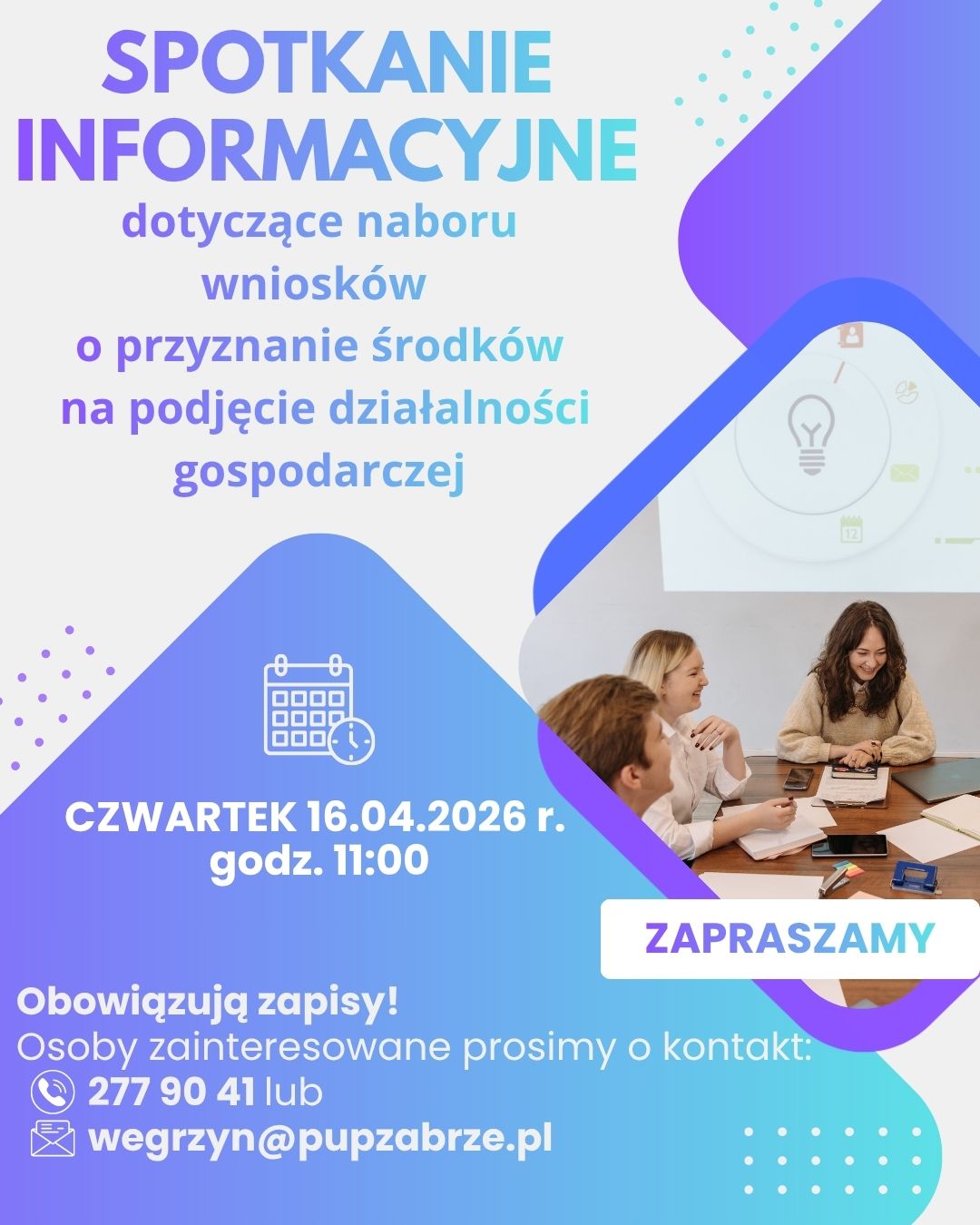 Osoby zainteresowane prosimy o kontakt mailowy: wegrzyn@pupzabrze.pl (w tytule maila prosimy wpisać: Zgłoszenie na spotkanie) lub telefoniczny pod nr. 277 90 41